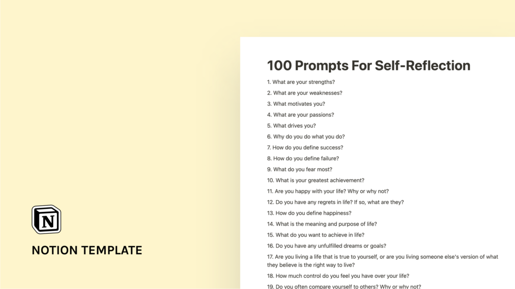 100 Prompts for Self-Reflection$0+$0+https://schema.org/InStockusdLife Pivot ProLife Pivot ProA free list of 100 writing prompts for self-reflection and discovery. Name a fair price:$I want this!Add to wishlist New wishlistShareShare on XShare on Facebook Copy linkCopy product URL